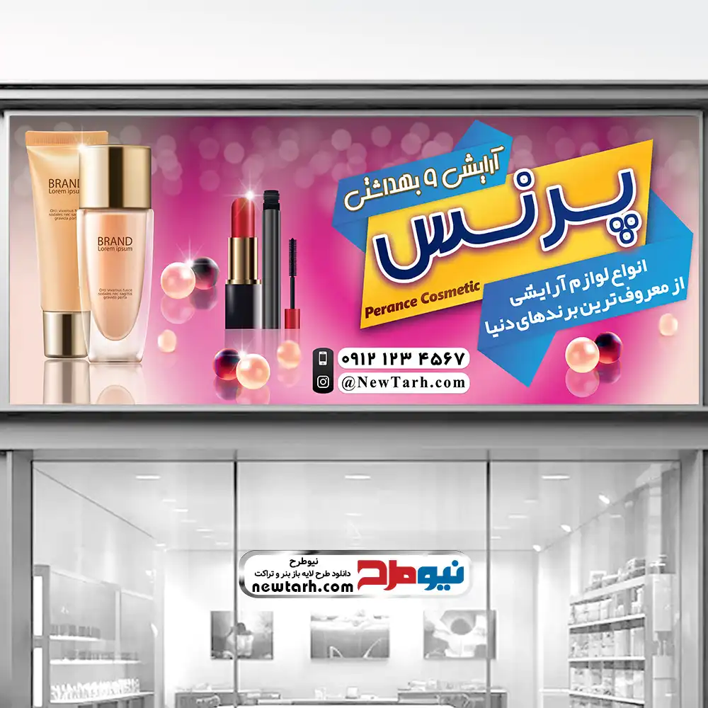 طرح psd بنر فروش لوازم آرایشی و بهداشتی در ابعاد ۱۲۰ در ۳۰۰ سانتیمتر و رزولوشن 72dpi طراحی شده که میتوانید بدون افت کیفیت برای چاپ بنر تابلو مغازه لوازم آرایشی از آن استفاده کنید.