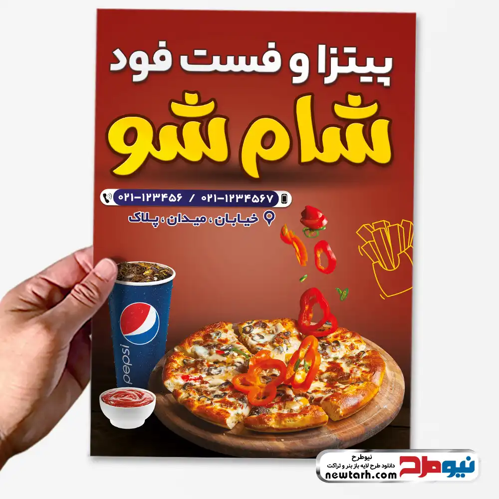 طرح psd تراکت پیتزا فروشی، از تصویر png پیتزا و تصویر با کیفیت لیوان نوشابه استفاده شده است.